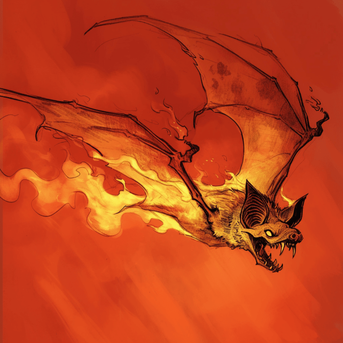- Forka the dogman, even with his helmet on, hears some kind of high-frequency sounds emanating from somewhere above and, through the mist, the PCs can see several glowing spots. They soon see what’s the meaning of all this when creatures plunge towards them: Flaming Bats!