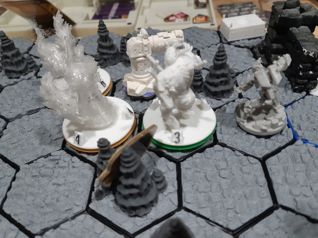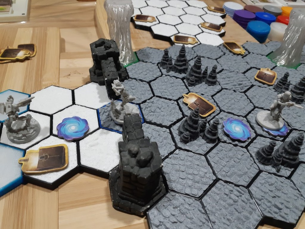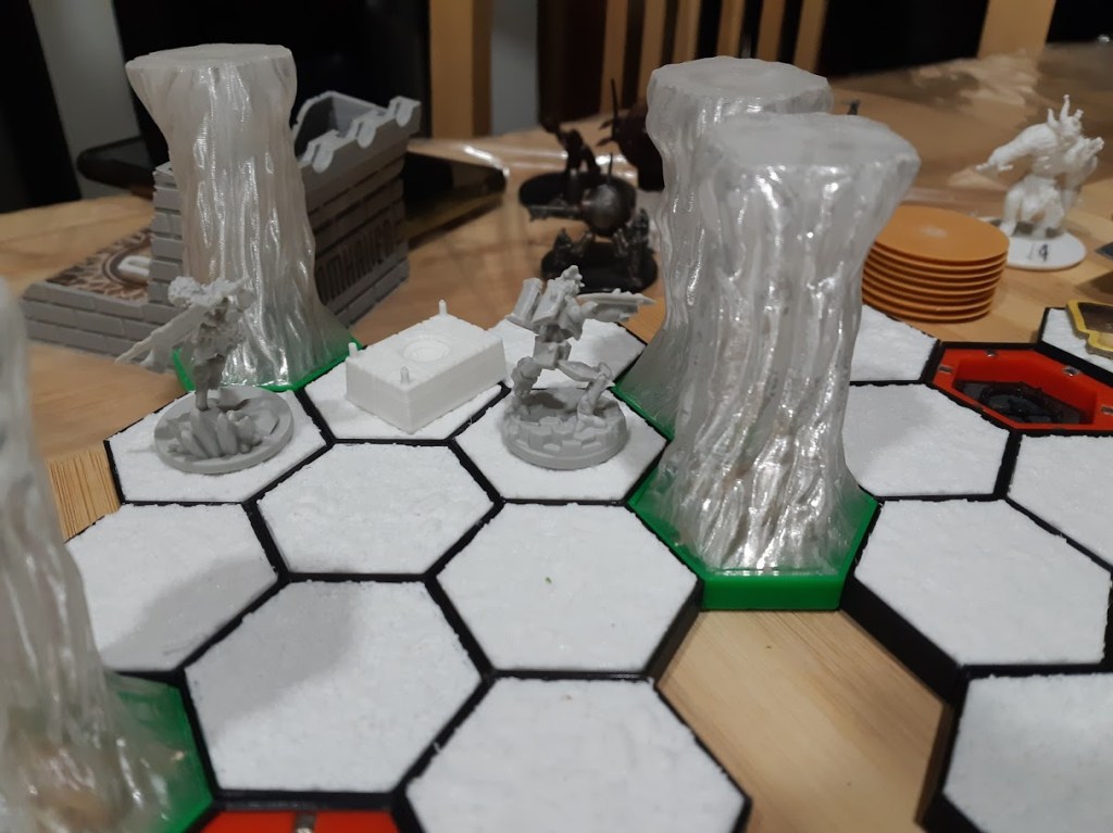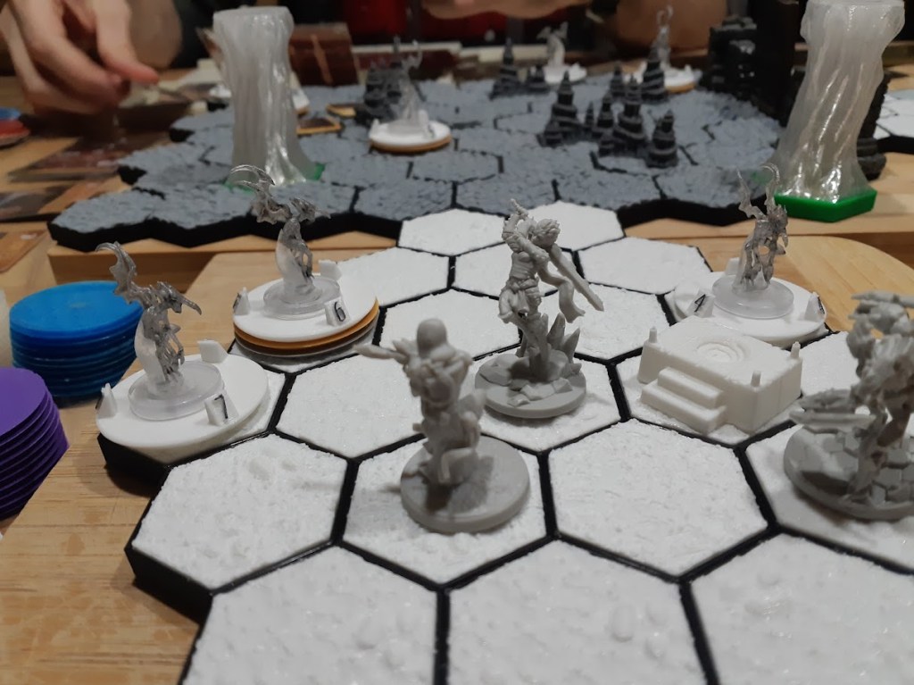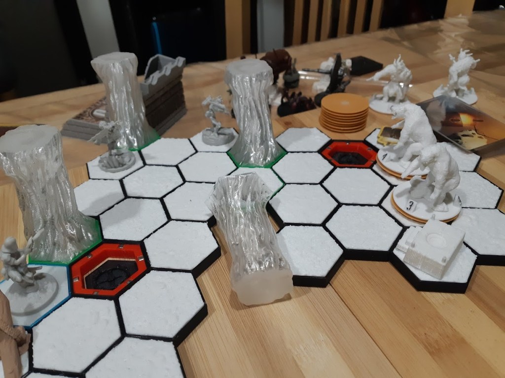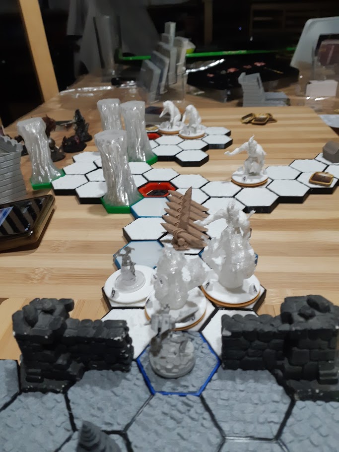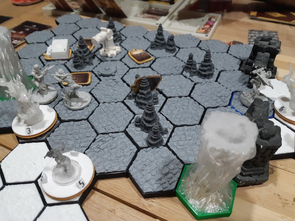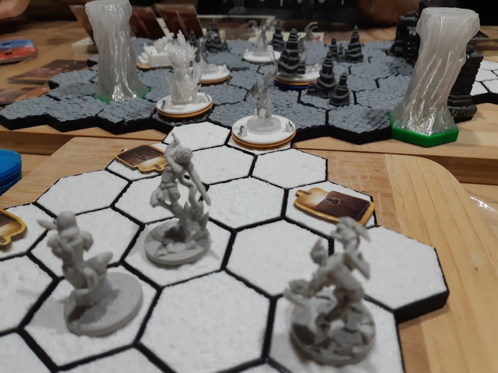 Pretty big map, we have to move our « sled » all the way to the back in order to break an ice wall with it, somehow. Also, one push (forego a top action) of the sled sends it hurling forward, possibly slamming into foes. A gamey mechanic but quite satisfying nonetheless.