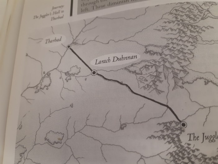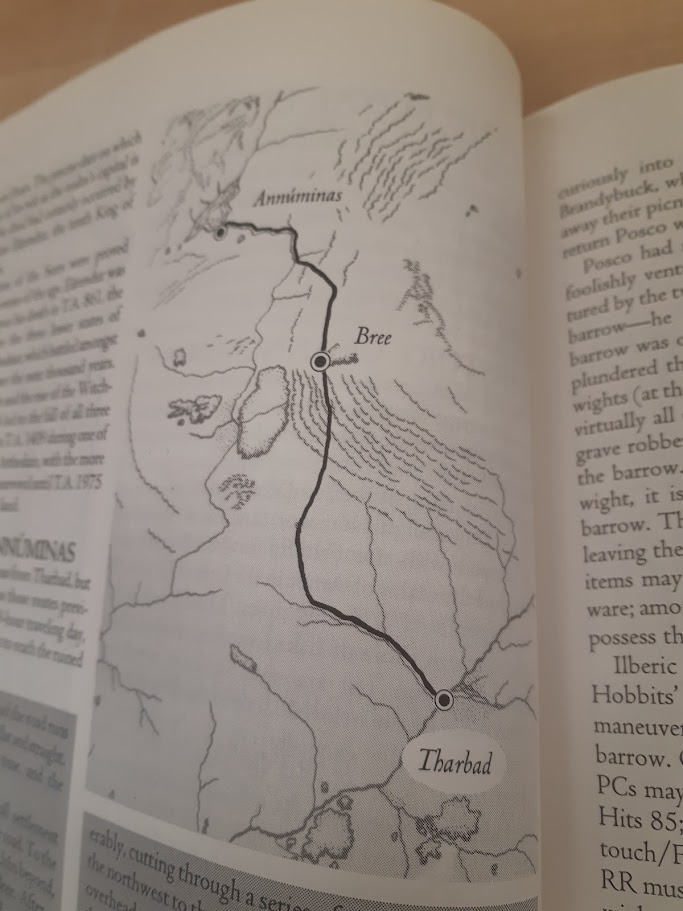 There’s one fixed event on the road whereas the PCs have the opportunity to save a wounded Eriadorian guy and defeat some hostile nameless Dunlendings. In similar fashion to the earlier chapter, the rescued NPC will ask if he can be escorted to the next point on our map, in this case the town of Larach Duhnan. There, the PCs will have to take the soul-rending decision of which of two inns will they sleep in for the night. As there’s nothing to do (and no npc roster), I suppose the Game Master will encourage the PCs to leave asap and get to Tharbad not that far away.