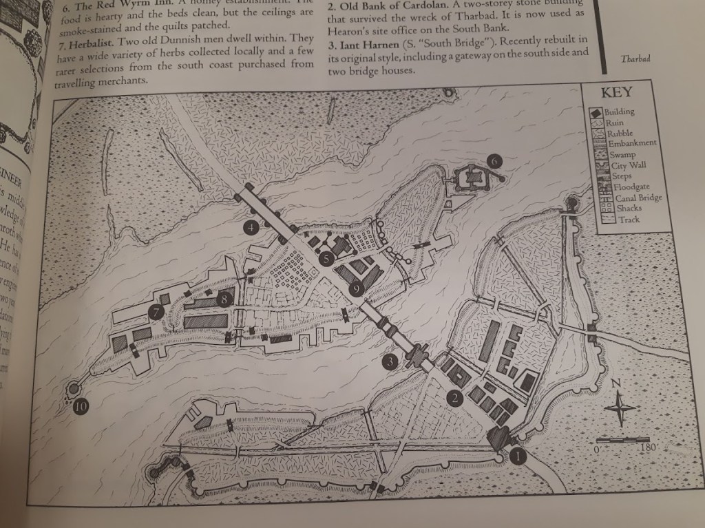 Then, the player characters reach Tharbad and, as they were told to do so by the Royal Seer back in Minas Tirith, meet Commander Cilis in the restored Royal House. The latter expresses his doubts that there’s any books left in the library, he has seen it a few years ago and it is « no more than a moss-covered ruin ». They also meet Chief-Engineer Hearon who brings them on a tour of Tharbad and we get: « this is a good opportunity for the GM to adlib some meetings with the multi-cultural work force enjoying a well-earned drink in the cool evening air. » Nothing else from these two NPCs, not even a if you happen to find a… or a be on the lookout for… You know, something signaling opportunities, danger, anything!