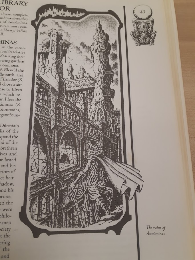 The city is completely in ruins, has been for centuries. The map (below) provides us with 10 keys but except for one (the Royal Library), they’re only for ambiance (i.e. « King’s Star Tower. A half-ring of stone remains from the royal observatory. It provides a sheltered camp site. »). There’s no encounters table provided either, though I suppose one could use the Old Arthedain‘s table of the Roadside and Wilderness Encounters found with the others at the end of the book.