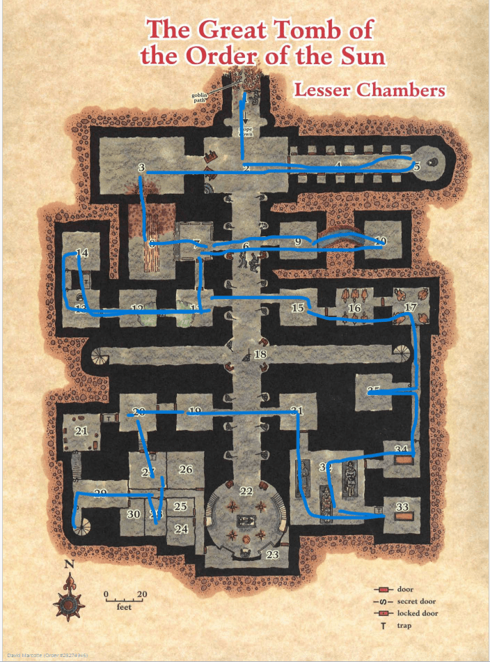 The tomb’s only entrance is collapsed with only a narrow path to get in (shown as the « goblin path » on the map even though there’s no goblins in the dungeon, a obvious sign that the dungeon has been refurbished and changed from its original purpose). The PCs will immediately have to confront the troglodyte sentries and do some tunnel fighting.