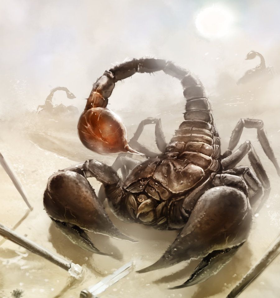 Sa carapace est difficile à percer et son attaque de dard, si elle atteint sa cible, est presque fatale. Encore une fois Anfi et Ed sont les cibles de l’adversaire tandis que Léon se téléporte plus loin (4)… Anfi fait deux Melf’s Acid Arrow d’affilé mais se fait ensuite saisir dans une pince et est dans une très mauvais posture. Par chance le monstrueux arthropode l’échappe (botch) et Anfi en profite pour lui donner de puissants coup de son marteau magique du Maître-Masson. Finalement, avec les PJs très blessés, mais avec le scorpion aussi amoché, le Sorcier des Sables rappelle sa créature (pour la préserver pour une autre fois) et le combat prend fin. C’est un match nul!